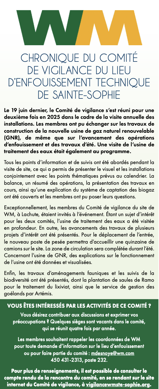 Mots clés: odeurs, traitement des eaux, aménagement nouvelles cellules, goélands, bilan Recyc-Québec, route locale, redevances
